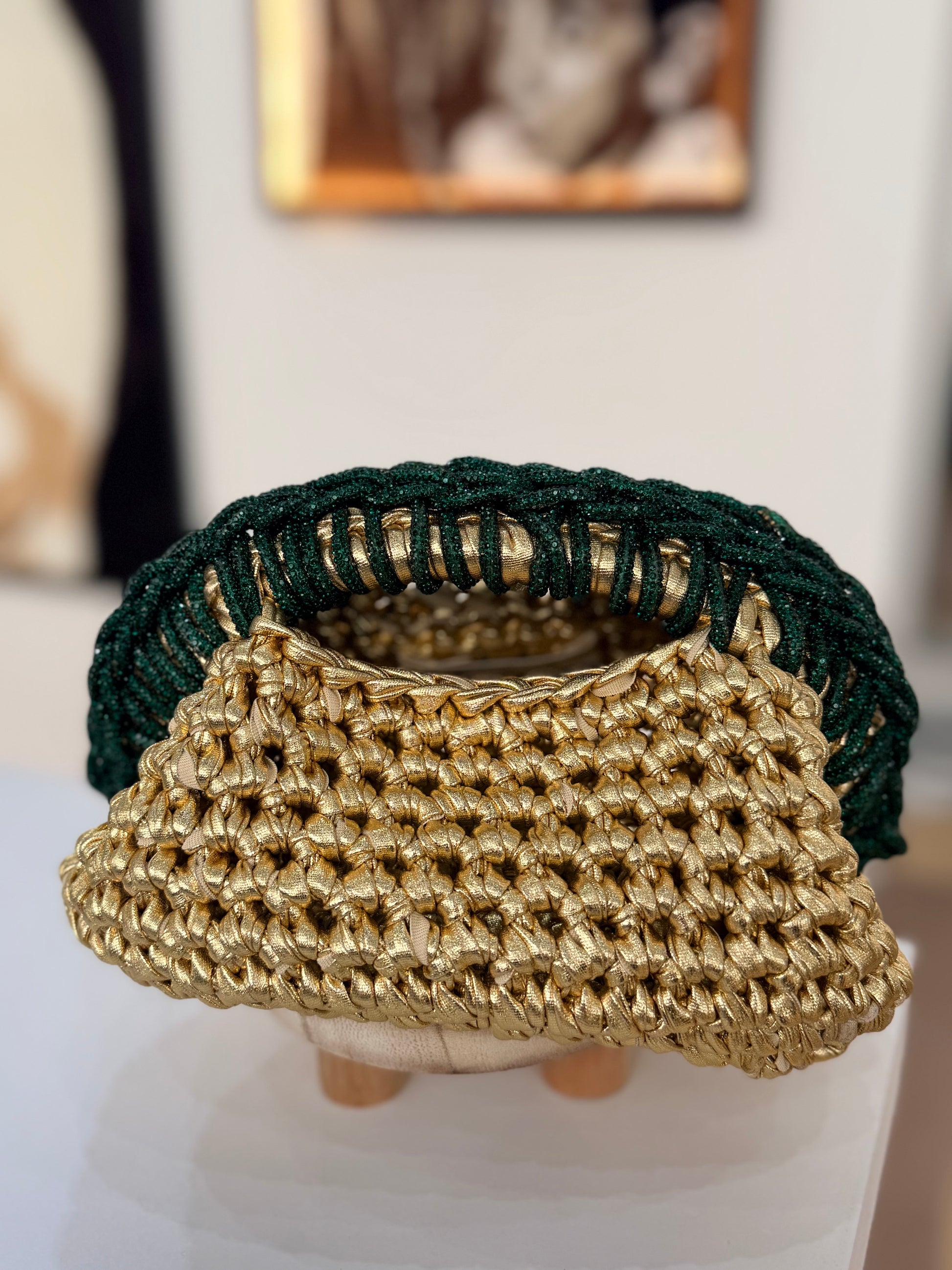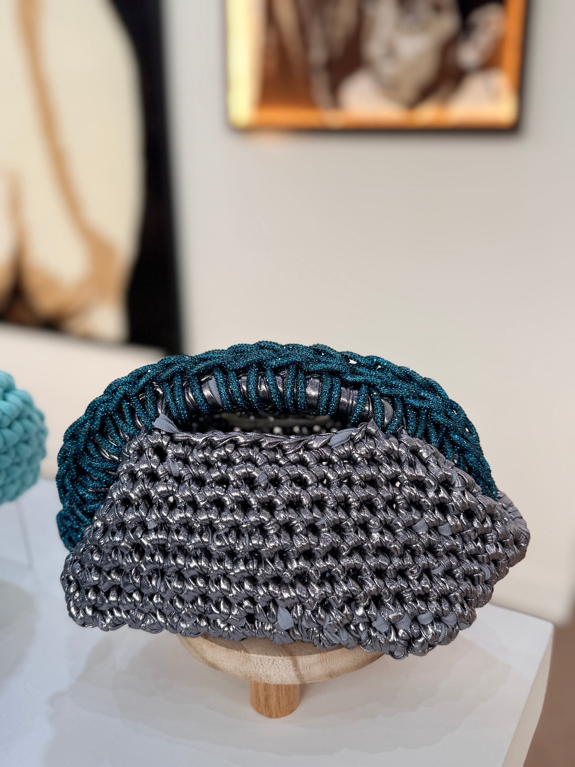 شنطة مصنوعة بخيوط الجلد ومسكة الكريستال