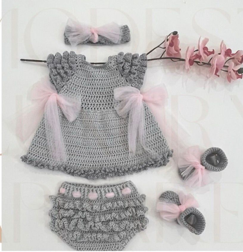 فستان مواليد كروشيه بلون رمادي أنيق